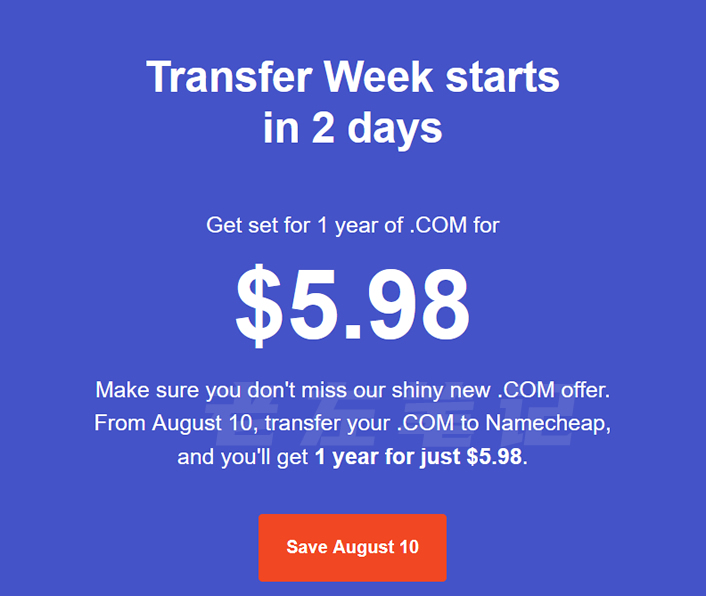 在文章中老 左有提到可以通过有些商家肯定会借助这次的.COM域名涨价的机会,提供新注册促销和转入优惠的策略吸引到用户转入到他们服务商。我们知道,在A域名注册商续费比较贵,我们可以通过转入B服务商,转入的同时会自动续费一年。比如今天老左看到Namecheap商家有推出转入COM域名$5.98,这个价格是相当便宜的。我打算把前几天看到的在一个月内即将到期的域名都转入进来。
