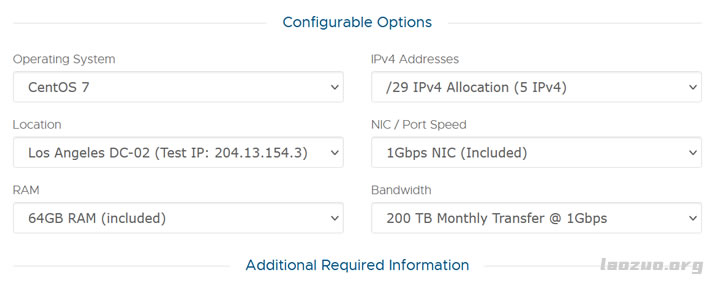 这里我们可以看到,系统有Linux和Windows镜像可选。IP地址默认是五个IP免费的,如果需要升级可以升级到253个独立IP地址,当然是需要付费的。带宽也可以升级到10G带宽。流量可以选择默认的200TB月流量(1G端口),以及可以选择100M带宽不限制流量。