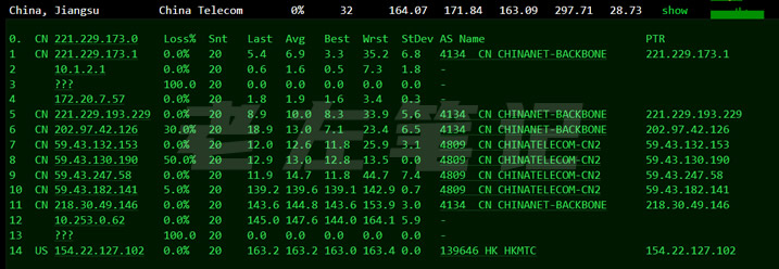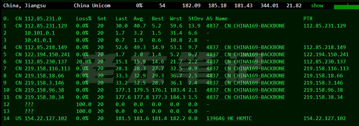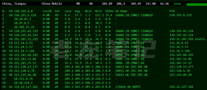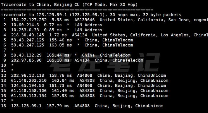 在上面我们可以看到去程是直连线路,我们看看回程是不是,找几个节点看看。