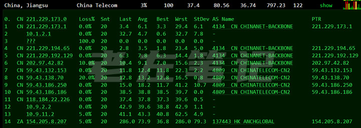 我们可以看到随机抽样的电信节点回程也是59.43优化CN2线路。
