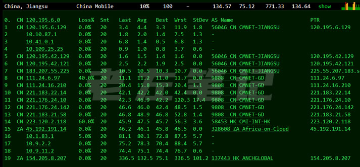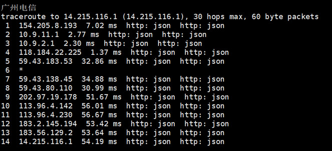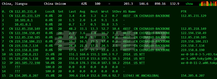 从PING速度可以看到,我们中国节点速度还是不错的。看来是真是CN2节点,具体我们看去程路由。