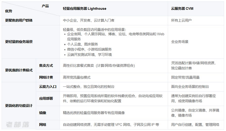 云服务器和轻量服务器到底有什么区别呢?在上面的概念中我们可能也看出来一二。不过,这里我们直接拿腾讯云文档解读的对比看看,比较直观。