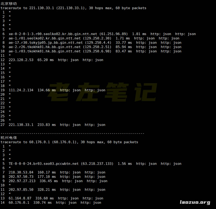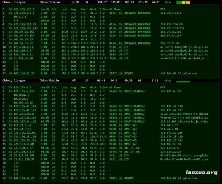 测试看看VULTR韩国首尔机房的节点去程电信和移动的走向。