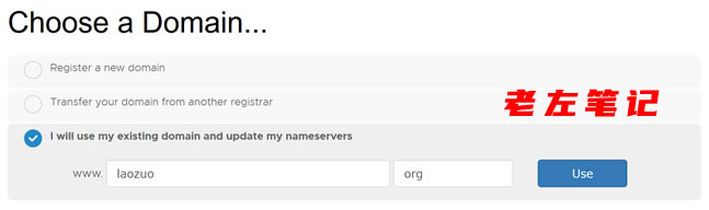 如果我们有买过虚拟主机的朋友应该清楚的,这里需要填写主域名。我选择自有域名,不在他这边买域名。