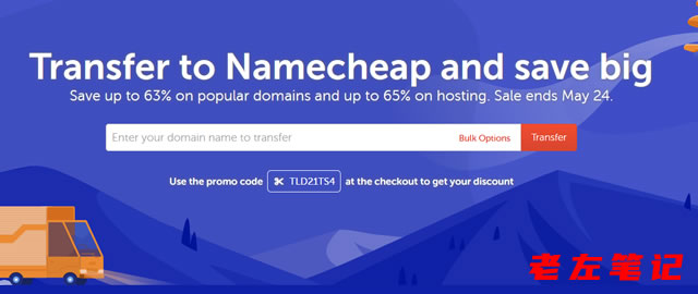 我们看看可以享受哪些域名折扣。Namecheap域名转入优惠活动将持续到5月24日,如果我们有需要续费的域名,可以转入进来享受续费优惠。例如com域名转移可享21%优惠,每年仅需44.94元,还是比较便宜的,老左(LAOZUO.ORG)准备这几天转入一个.ME域名进来。