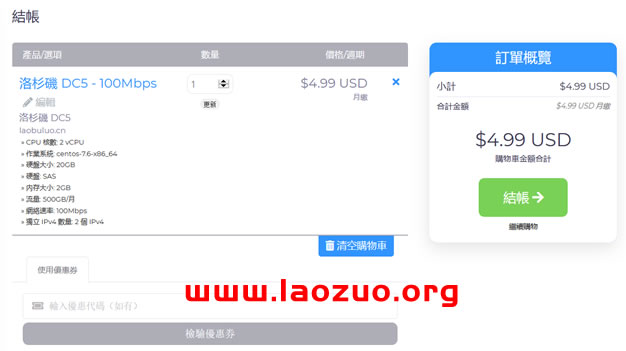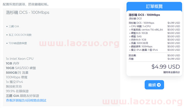 | DC5-100Mbps | 1核 | 1GB | 10GB | 500GB | 100Mbps | 1个 | $4.99/月 | 购买 |