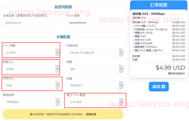 然后我们设置主机名以及ROOT密码。这里有个奇怪的事情,根据前端介绍,我们可以看到是1G内存、1核、10GB硬盘、1IP地址,但是这里居然可以选择双倍,比如2核、2GB内存、20GB硬盘、2个独立IP地址,而且价格还是4.99美元每月。