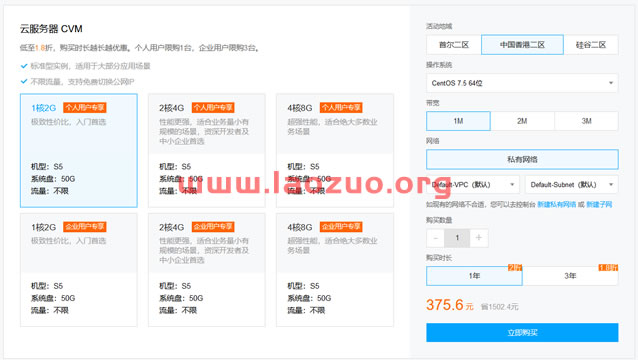 我们可以看到个人和企业各有三个方案可以选择,仅限新用户订单。个人可以选择一台,企业可以选择三台。可选韩国首尔、美国硅谷、中国香港机房。
