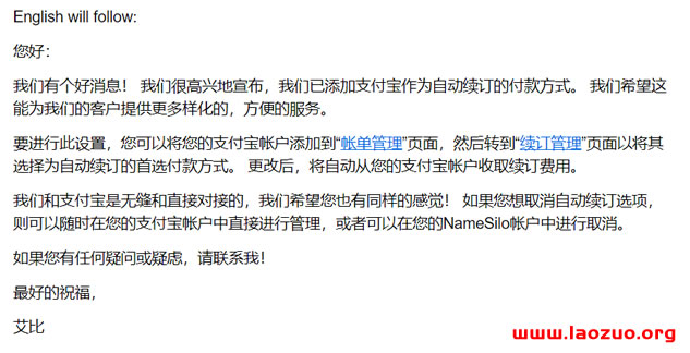 今天下午的时候,老左收到来自NameSilo 的推送邮件,我还以为有域名到期忘记续费的邮件提醒。这几天由于比较忙一直在外面,所以没有在月底之前续期下个月可能要到期的域名,具体我还没有去查看是否有需要续约的域名。这不收到今天的NameSilo邮件看到居然不是这个问题,而是新增支付宝支持自动续期。