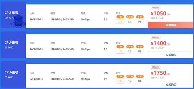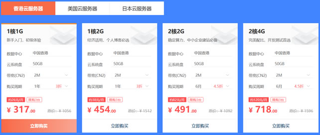 我们可以看到香港云服务器、美国云服务器、日本云服务器。配置上2M带宽起步,这个比阿里云和腾讯云还是有诚意的。而且最高可以购买三年,CN2线路,适合有需要和我们大陆速度相当且可以不要求备案的业务需要,建站还是比较合适的。
