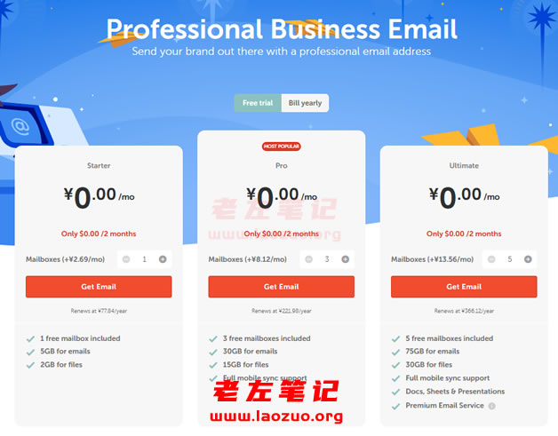 这次,老左有看到Namecheap 企业邮局还在做活动,三个套餐的企业邮局可以免费使用二个月,而且续费还可以继续半价优惠。我们是不是有需要体验一下。