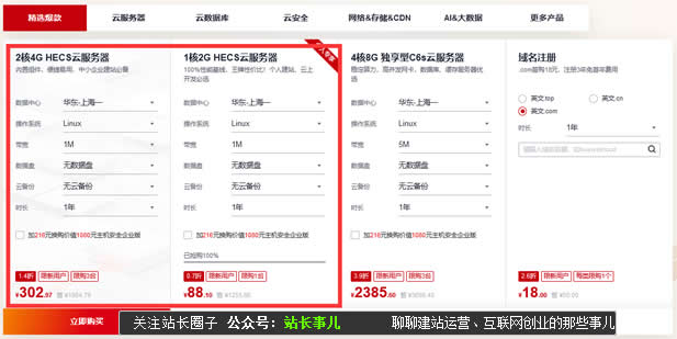老左有在前面的活动中有记录到国内的腾讯云和阿里云的促销活动信息,这里我们看到华为云商家也是有促销活动的。活动截止到三月底,我们新用户折扣力度也是比较明显2GB1M年付88元,2核4GB内存服务器仅需要302元,适合我们有在其他商家没办法注册新用户的,在华为云可以享受低价。