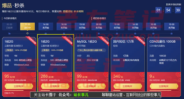 这次活动依旧是延续以前的活动特点,采用爆品秒杀活动,每日5场秒杀,爆品1核2G云服务器95元/年(288元/3年),限量抢购,还有各种规格配置的云服务器和轻量应用服务器、云数据库、COS存储容量包、CDN流量包、直播/点播流量包、国内短信包等云产品可以选择。