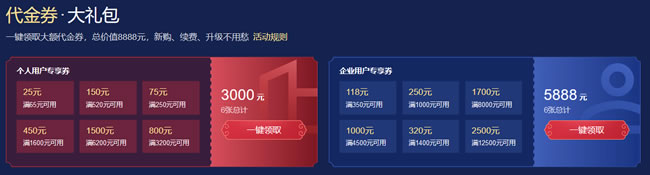 同时我们也可以领取企业和个人的代金券,可以用于新购、续费和升级使用。