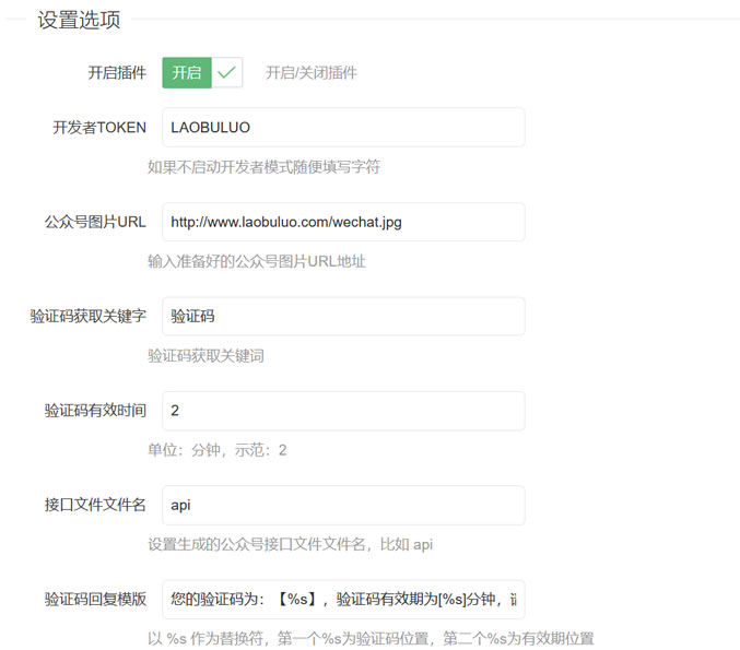 安装插件之后我们可以看到需要设置参数,设置之后我们可以在微信公众号设置自动回复的链接。