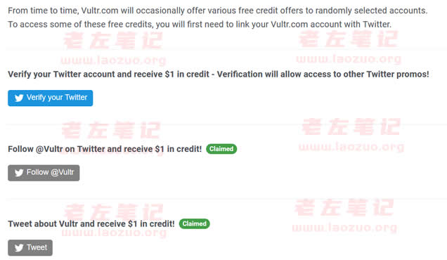 比如这个问题也是前几天老左有在”2021年Vultr新用户福利注册账户赠送50美元(有效期30天)“文章中提到我们可以新注册账户申请VULTR薅羊毛的问题,新用户是可以领取余额有效期三十天。实际上我们在登录VULTR后台还可以看到”Good News – Your account can earn some additional free credit! Click here to view available promos”的字样,我们点击后发现还可以薅羊毛。