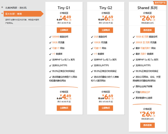 迷你虚拟主机方案包括中国香港和美国机房。500M硬盘、50GB流量月,年付67元左右,适合个人建站独立个人博客或者企业网站使用。