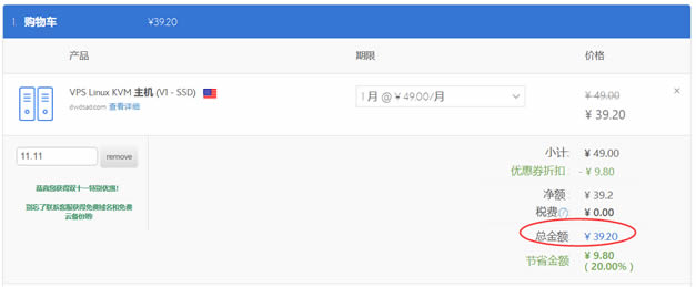 可以看到目前VPS主机只有美国机房,之前是有香港机房的。双十一折扣是2GB内存起步套餐2核心月费用39元,还是比较有性价比的。