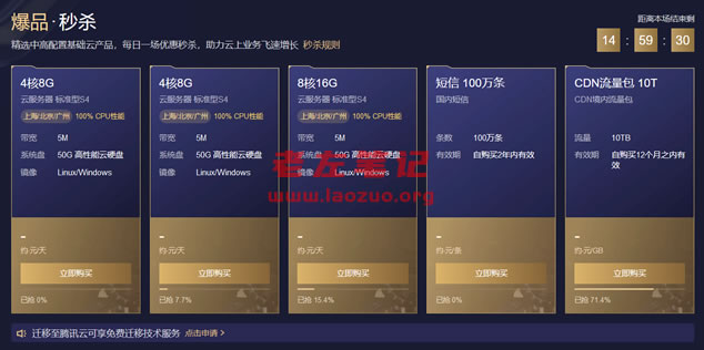 在大促期间采购大配置、长年限的服务器是比较划算的。这次提前购活动云服务器为主,后面会开启其他云产品。秒杀商品中,云服务器限购2个,短信限购3个,CDN流量包限购1个;每场次每个商品仅可秒杀1个,限购数量大于1的产品可分次秒杀。