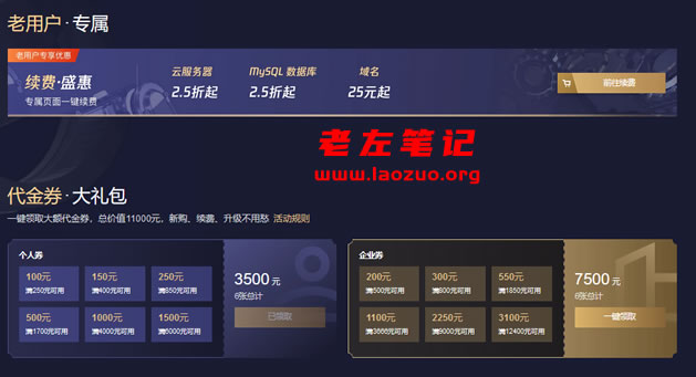 如果我们是老用户老产品需要续费的,可以参与到续费优惠,力度折扣是比较大的。同时,我们可以领取代金券用于续费升级和新购。