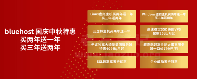 这次国庆节和中秋节,BlueHost商家也发布活动,比如虚拟主机买2年送1年,买3年送2年,以及VPS、独立服务器都有响应的优惠。
