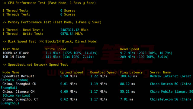 这里测试随机脚本自带的下载速度和CPU性能测试。