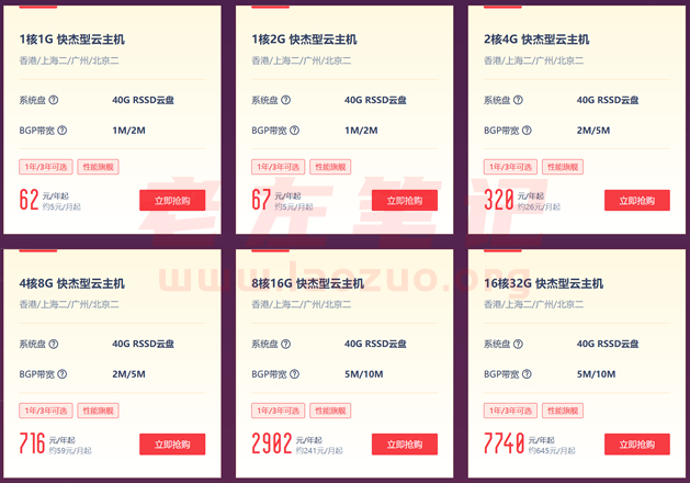 我们可以看到有云服务器促销,力度还是比较大的,最高可以三年。不过你如果有企业资格认证的新账户,会比个人还便宜点。有香港和上海等多个机房可以选择,老左个人建议选择2M带宽的,太大的太宽不要选择,因为他们回程是有限速的。且建议买三年。