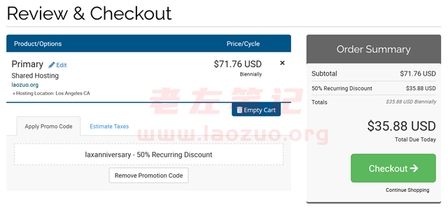 这里老左简单的测试虚拟主机选择洛杉矶,一般我们也就选择洛杉矶。虽然也有香港和新加坡机房,但是速度一般并非直连,一般不选择。然后自动可以看到半价优惠,或者我们自己输入优惠码激活也可以。两年35美元虚拟主机,是不是确实还便宜?