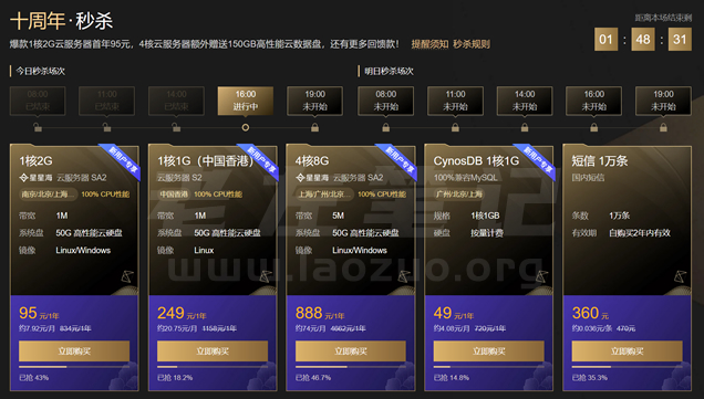我们可以看到每天有五场秒杀活动,我们可以根据时间然后看看今天或者预告明天时间段有没有自己需要的产品。我们可以看到新用户爆款活动力度比较大的,年付最低2GB内存方案95元,以及还有香港云服务器低至249元一年。