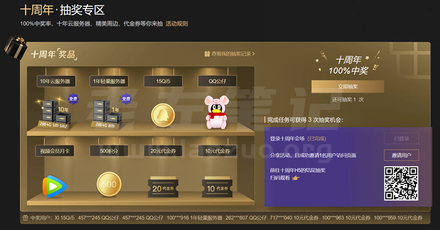 这个抽奖活动还是蛮有良心的,只要我们邀请用户访问页面,就有机会抽奖,而且是百分之百中奖的,比如有代金券、QQ币、公仔以及腾讯视频会员等。