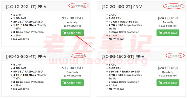 我们可以看到目前四个套餐的库存情况。这里我选择基础1GB内存方案,年付12美元方案。