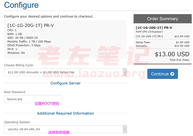 我们看到居然还有1美元的设置费,这个不要紧,后面我们可以抵扣掉优惠券。我们这里需要设置ROOT服务器密码,以及选择镜像。
