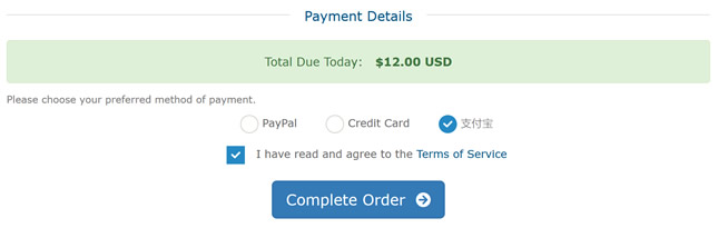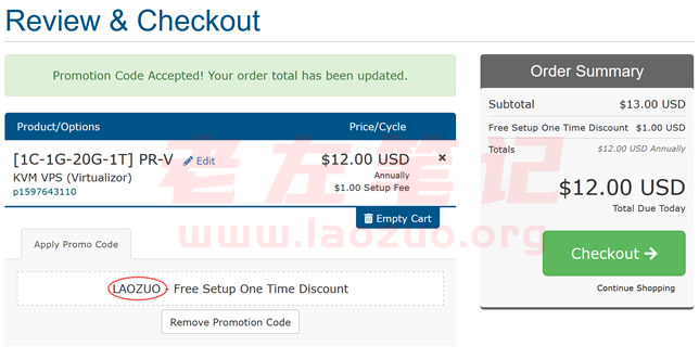 这里我们输入”LAOZUO”优惠码,然后激活可以节省1美元只需要基础的服务器费用,这里我选择是是年付12美元套餐。然后我们去CHECKOUT去结算。如果我们没有账户的则需要注册账户,如果有账户登录。注册账户需要用英文或者拼音。