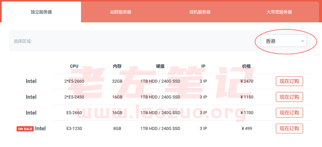 这里我们可以看到有独立服务器、站群服务器、母机服务器以及大带宽服务器,当然我们可以看到上图所示,不要买错有香港和美国机房可以选择。我们可以看到不同的配置方案配置是不同的,比如香港服务器默认是三个IP独立IP地址,而且基础的配置是8GB内存可选240GB SSD固态硬盘或者是1TB HDD硬盘的。CPU是E3-1230,价格还是比较便宜的月付499元。