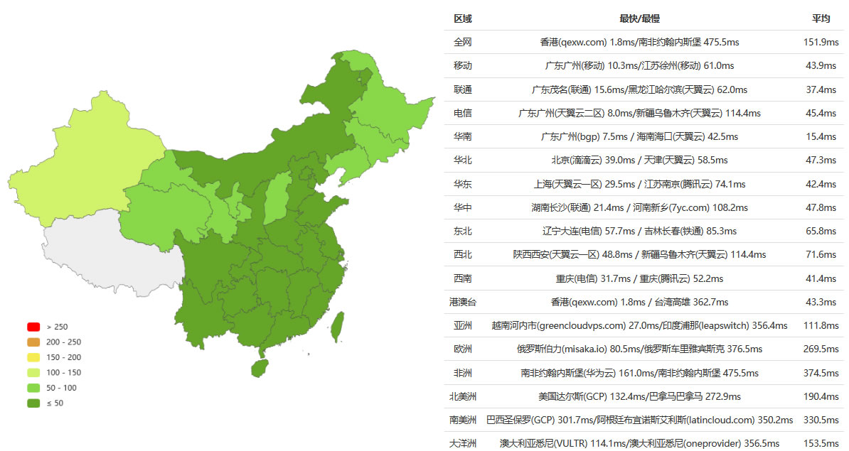 这里我们采用在线PING测试工具,可以看到PING速度还是比较优秀的。