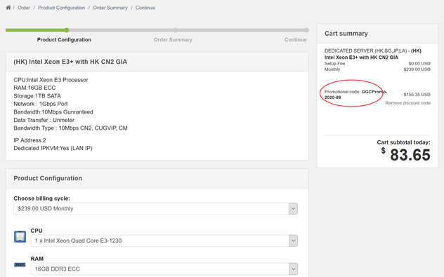 我们可以看到激活优惠码之后,可以看到只需要83美元一个月。对于我们有需要香港服务器的朋友,可以试试。