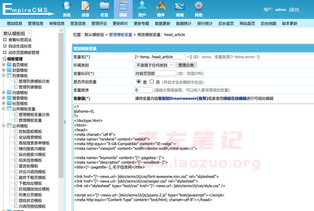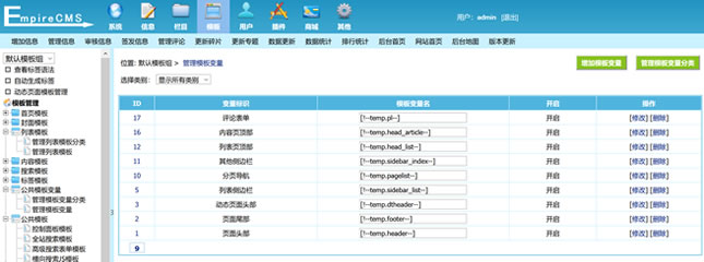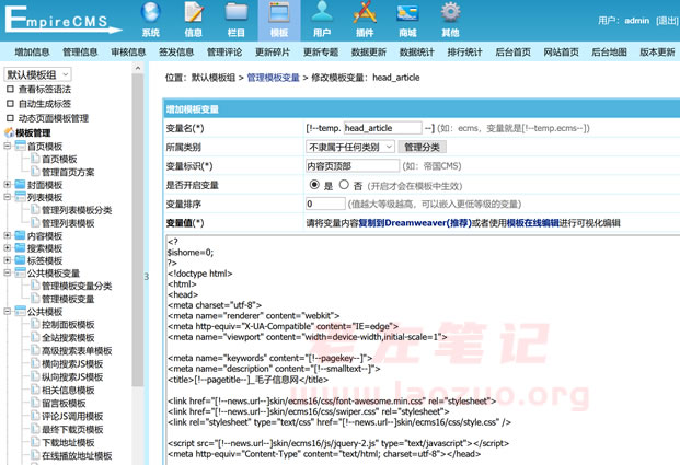 我们登陆帝国CMS后台,然后看到左侧模板管理,找到管理模板变量,可以看到也页面头部。然后修改看看。