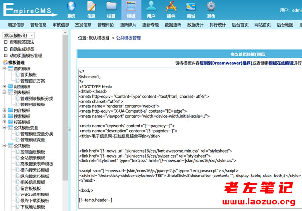 我们很多使用过帝国CMS程序的朋友应该知道,这个CMS的主题修改和一般程序是不同的,他的主题模板是需要在代码中修改的,可以直接在后台修改,采用的嵌套标签模式。以前老左是有使用过的,已经多年没有使用过,就准备帮他看看。