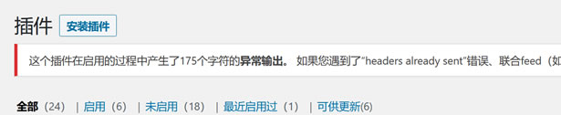 今天老左有在安装一款WordPress插件的时候后台有提示”这个插件在启用的过程中产生了xxx个字符的异常输出。如果您遇到了“headers already sent”错误、联合feed(如RSS)出错等问题,请尝试禁用或移除本插件。”的问题,这个到底是什么问题导致的呢?