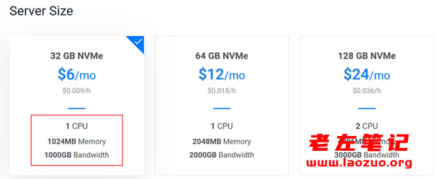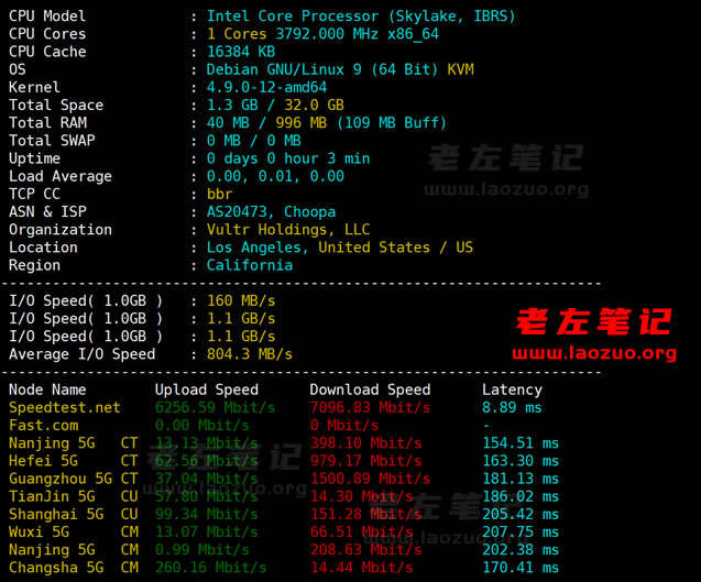 我们可以看到使用的是SSD NVMe硬盘。这里作为演示测试,老左准备选择洛杉矶机房1G1C服务器。我们看看到底这个高性能服务器的性能有多么厉害。当然,如果我们有兴趣的话也可以用普通云服务器对对比,老左在之前文章中也有记录过(Vultr VPS洛杉矶机房速度、IO性能、系统配置等综合性能评测)。