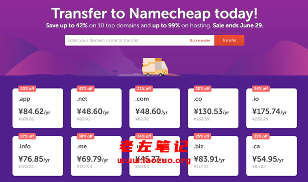 今天早上老左翻看邮件的时候看到Namecheap商家再次发布域名优惠活动。前一段时间以新注册域名促销的,这次是转入域名优惠活动,这件最近一段时间NC商家也是促销不断,不清楚是由于疫情日子不好过呢,还是商家希望通过外围还没有商家促销的时候密集的促销拉拢更多的用户。