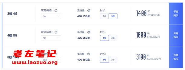 目前我们看到的UCloud香港云服务器是2核心4GB内存2M带宽,年付500元,三年1400元,这个配置还是相当不错的。如果我们需要香港云服务器,老左个人建议买这款。这里有个小技巧,一定要选择和活动配置一致的配置且需要先领券自动折扣。
