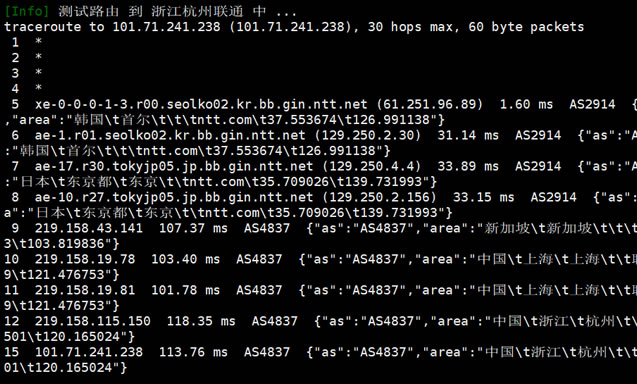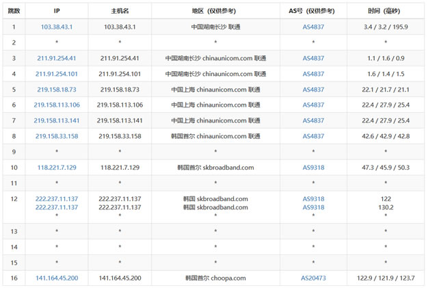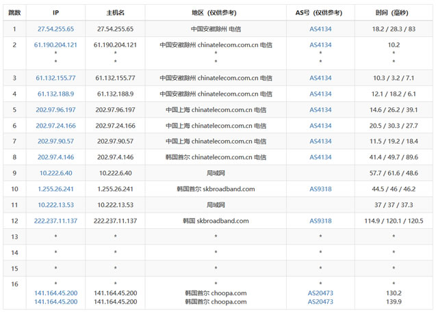我们可以看到三网电信、联通、移动三网的去程路由都是韩国 SK 线路直连,还是不错,但是主要还是要看回程。