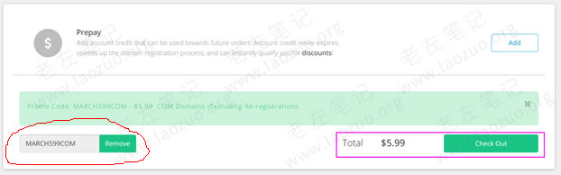 前几天老左有在Dynadot新注册域名时候的价格还是6.99美金.COM域名,且有在Dynadot删除域名文章中有提到过。隔天后看到新注册域名是7.99美金,包括目前我们看到的官方标价也是.COM域名是7.99美金,但是老左在访问后台的时候无意中看到弹出的信息框中可以使用优惠码只需要5.99美金,如果有需要注册.COM域名的可以在这家,目前价格在周边几个同类商家中还是便宜的。