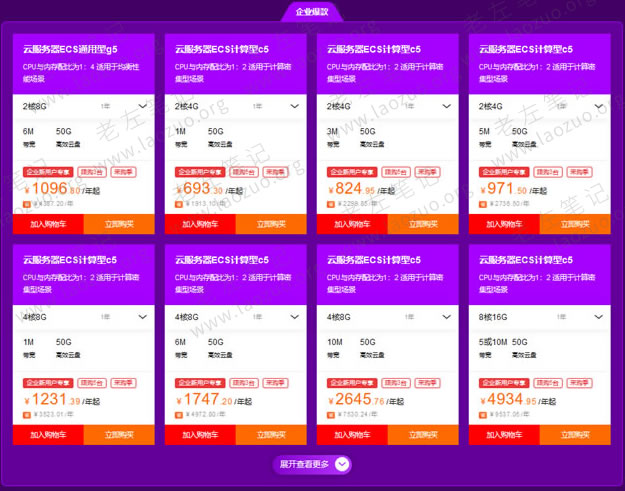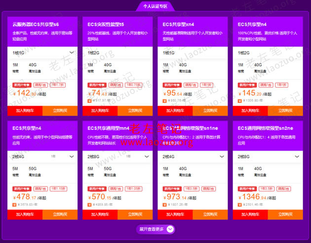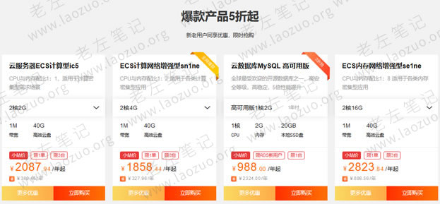 同样的在上面可以看到个人用户活动比较少。页面标注新用户专享类优惠,仅针对阿里云注册新用户首次购买云服务器ECS产品时可享 受,同一用户仅限参与1次,每次限购1台(以页面为准),本活动不与其他活动或优惠 叠加适用。同时,我们可以看到在活动专栏有新购满多少赠送淘宝红包,以及参加抽奖活动,这里老左就不再重复,我们一看就明白。