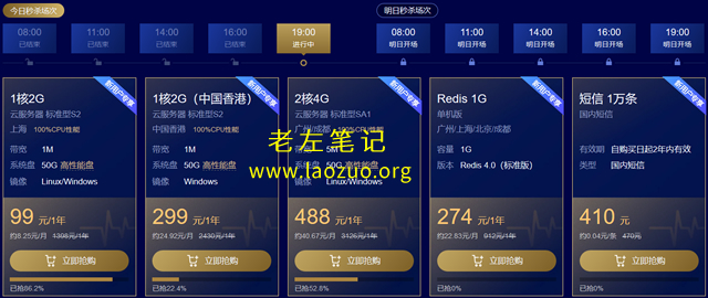 每天8:00、11:00、14:00、16:00、19:00 五个时间点可以参加爆款秒杀活动,其中配置和性价比比之前更加力度大一些,比如起步是1核2G1M云服务器首年99元,三年云服务器299元。同时也有香港服务器Linux年249元,Windows年299元。