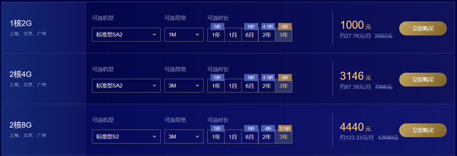 我们可以根据实际需要和时间节点选择。入门阶段建议购买三年299元套餐,1M带宽入门是够用的,对于中等项目的以及网站后续有发展的,建议一次购买三年配置稍微高点的。