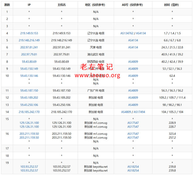 这里老 左挑选一个延迟稍微高的大连电信节点测试了路由。
