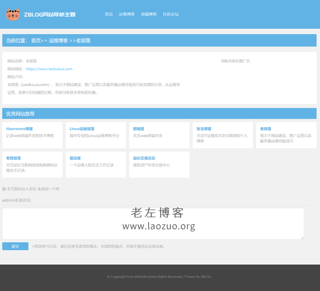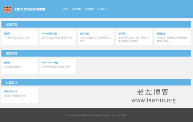 最近一段时间老 左也在思考这个网站可能后续会有转型,毕竟优质主机商就那么几个,新商家也确实难以竞争,对于常规的运维内容大部分都可以搜索到解决方案。这个网站可能会陆续的整理一些人为有用的资源、或者软件类内容。在这篇文章中,老 左分享一款简单的ZBLOG PHP目录导航主题,适合有需要细分行业或者个人使用的目录网站。