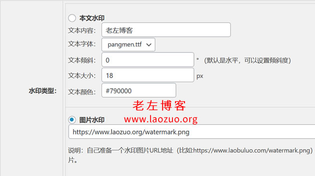 这里我们可以看到设置文本或者图片水印,文本可以设置大小和字体,字体可以根据自己喜欢字体然后自定义上传字体样式。如果我们后面需要用到透明水印,还是要用到图片样式,PNG格式。图片我们可以自己引用本地或者远程的图片即可。